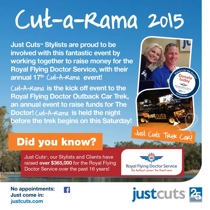 Just Cuts™ Stylists are proud to be getting involved with this fantastic event by working together to raise money for the Royal Flying Doctor Service, with their annual 17th Cut-A-Rama event. The Outback Car Trek is an annual event that donates the funds it raises each year to The Royal Flying Doctor Service.